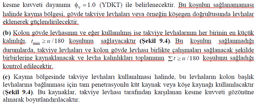 - Yeterli olmaması durumunda kolon üzerine takviye (gövde) levhası ekleyebilirsiniz. Takviye levhalarını guseli birleşimlerde birleşim bölgesini kapsayacak şekil de geniş tutun. Tapa kaynağı kullanılmadığı sürece, gövde takviye levhasının kolon gövdesiyle beraber çalıştığı kabul edilmez ayrı ayrı olarak u/180 şartı kontrol edilir, bu nedenle tapa kaynağı takviye levhasında kullanılmalıdır. Tapa kaynağı kullanıldığı takdirde ekstra olarak bu kaynakların çevresinde de bu kontrol yapılır ve sağlanması gerekir.