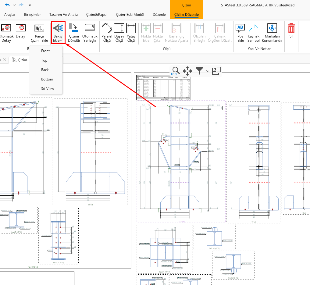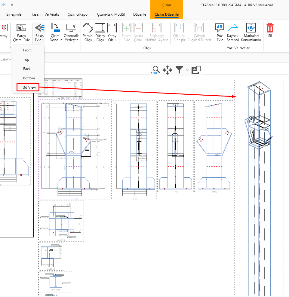 ÇizimYeni Çizim ModülüÇizim Düzenleme Bakış Ekle Herhangi bir çizim seçilerek ilgili çizim için farklı bakışlarda çizimleri ilgili sayfaya otomatik eklenebilir. Örneğin ilgili çizimi seçili hale getirip 3d bakış çizimini sayfaya ekleyebiliriz.