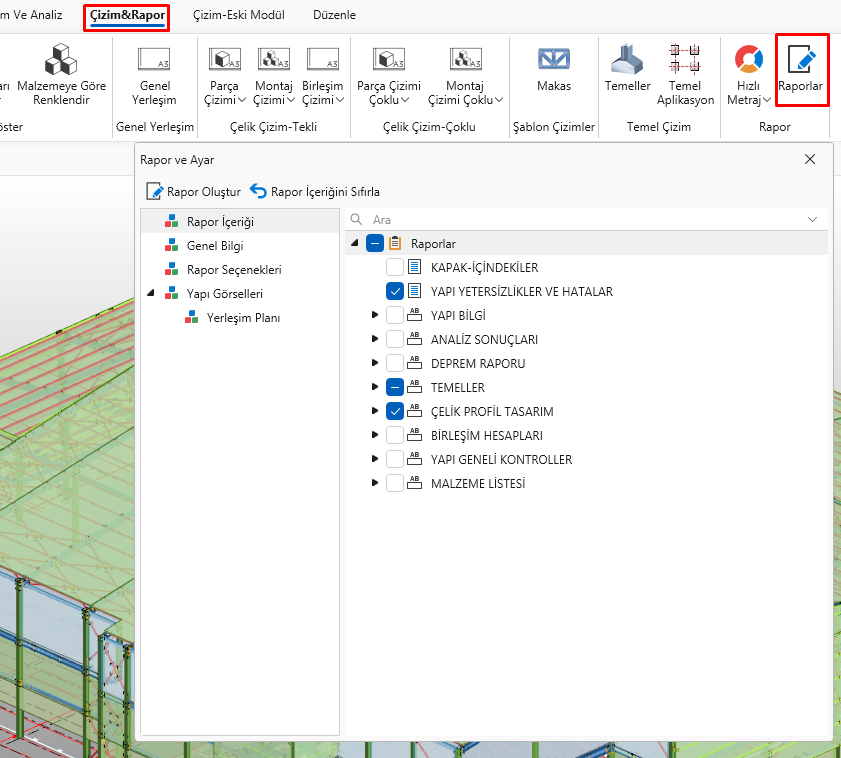 Rapor almak ve rapor ayarlarına ulaşmak için Çizim&Rapor üst menüsünde raporlar bölümüne girilir.