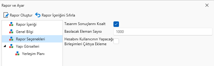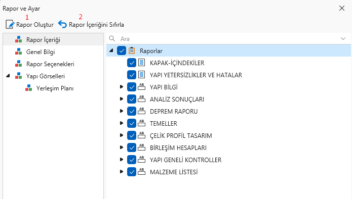 - Rapora dahil edilecek başlıklar seçilir ve 1 numaralı butona basıp rapor oluşturulur.